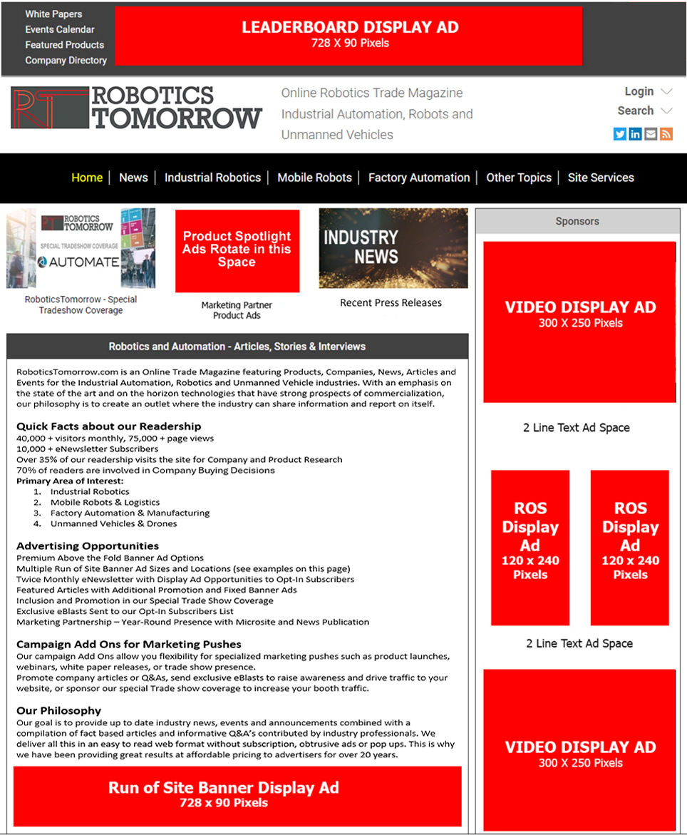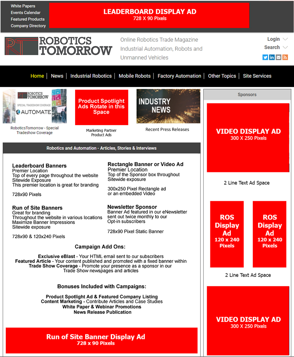 - Bonus Ad Views – RoboticsTomorrow does not sell extra space to 3rd party ad servers. Unsold ad views are shared among our clients at no extra charge.