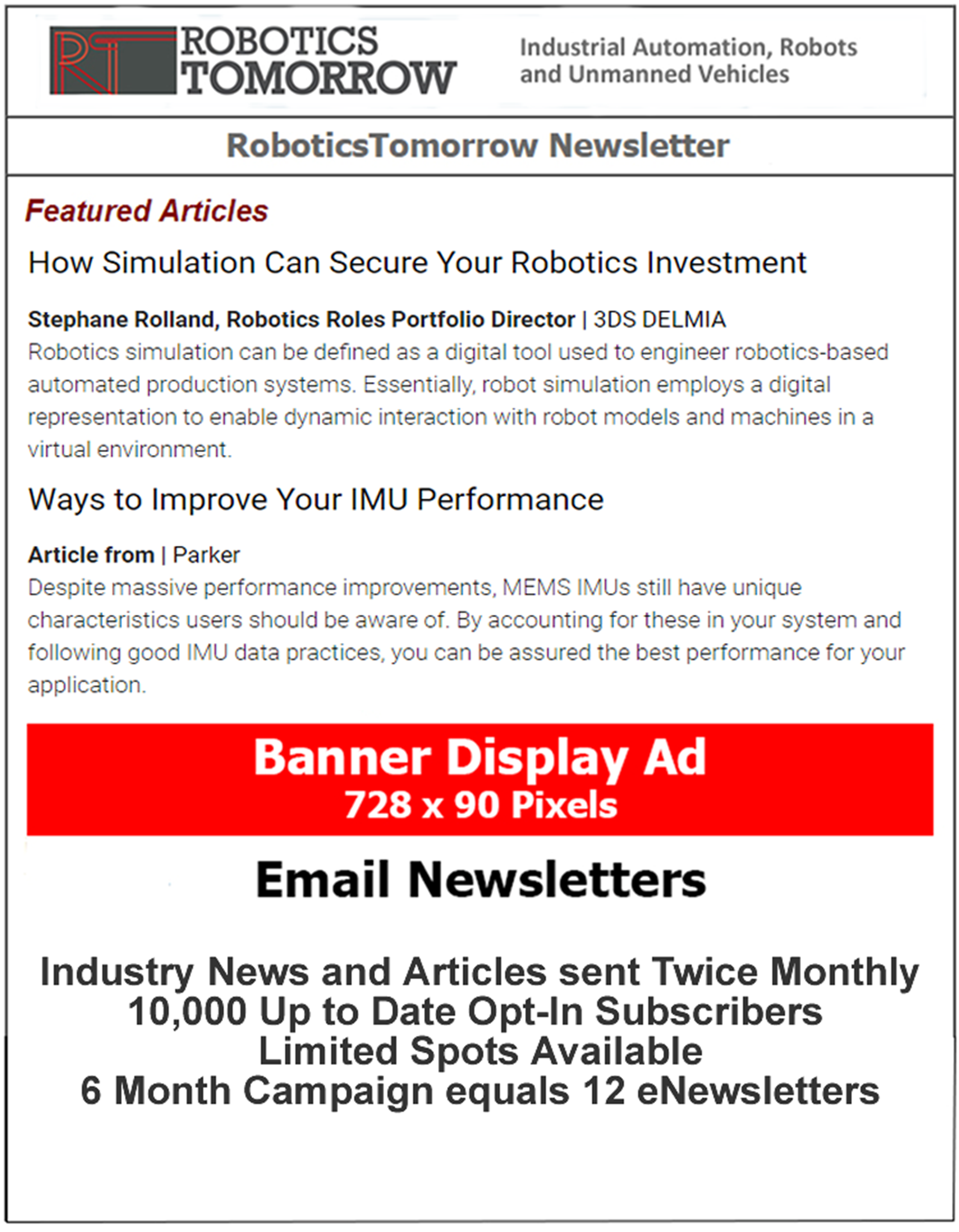 - Read and analyze the statistics when you get them and modify your ad campaign to improve performance or to reach a different customer. These are real numbers ... and RoboticsTomorrow provides the flexibility ... so use them to your advantage.