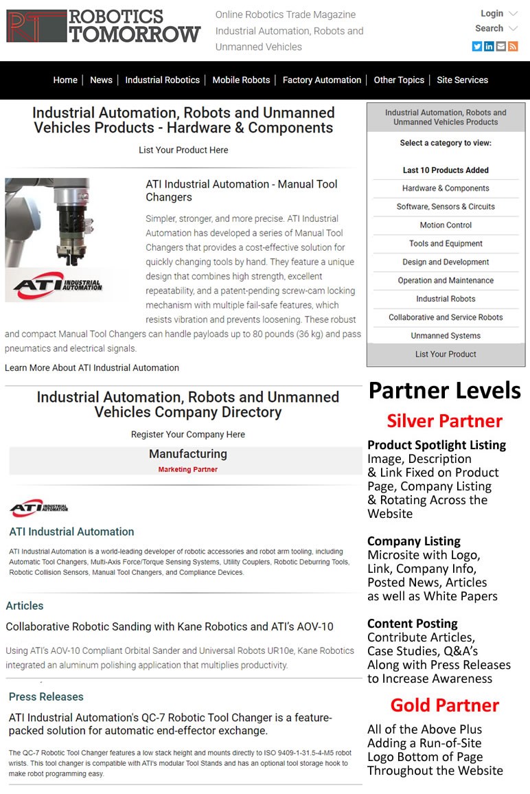 RoboticsTomorrow.com is an Online Trade Magazine featuring Products, Companies, News, Articles and Events for the Industrial Automation, Robotics and Unmanned Vehicle industries. With an emphasis on the state of the art and on the horizon technologies that have strong prospects of commercialization, our philosophy is to create an outlet where the industry can share information and report on itself.