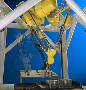 Since the invention of the parallel-link robot back in the early 1980’s, it has evolved into an innovative and high-speed solution for a wide range of assembly, picking and material handling applications. A parallel-link robot’s actuators act on the tooling or work-piece in parallel rather then in series. With a conventional or serial link robot, each axis moves each successive axis’ actuators all the way to the tooling interface. For a six-axis robot this means that axis one moves the tooling and work-piece and all the actuators for axes two through six. With a three-axis parallel-link robot, each axis is connected directly to the tooling interface. The movement of these three axes (either one or a combination of all three) will move the tooling interface in XYZ. A fourth axis can be directly connected to the tooling interface to generate rotation. Because each axis only needs to accelerate the tooling interface, much higher acceleration rates occur, which may result in reduced cycle times compared to a serial robot. Top speeds of 10 meters per second are typical for most parallel-link robots. In addition to high speed performance, another significant advantage of a parallel-link robot is improved accuracy at the tool tip.