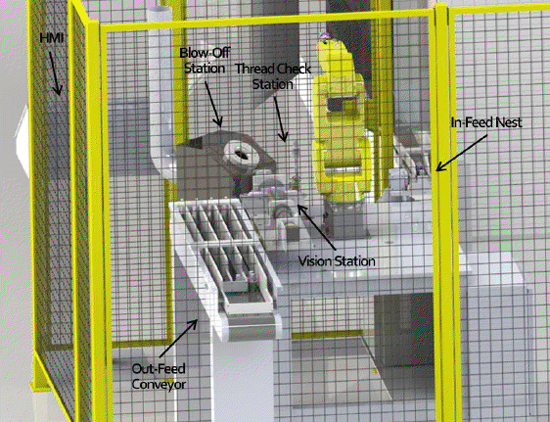 The robot moves the part to the New Vista Thread Verification Unit for inspection; this unit tests the pitch and depth of the part's internal threads