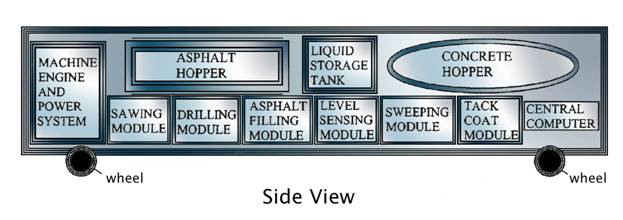 With his training and experience, he developed a patent combining robotics with road repair equipment. A Robotic Road Repair Machine or RRRM. The advanced, full-automated technology provides a cost effective, quicker, and safer system for asphalt and concrete surface repair. The technology comprises an automated, modular, and wheeled road repair machine, including a vehicle with slots designed to receive work modules. The technology analyzes and repairs surface imperfection in road surfaces and sub-layers. The RRRM completes multiple repair tasks as it moves over the surface of the road. The deployment vehicle is self-contained and controlled by a complex central computer. The critical element of this master machine is the computing operating system technology: the technique of communicating to the robotic modules, controlling them, and the integration of the interchangeable robotic module hardware into the overall machine.