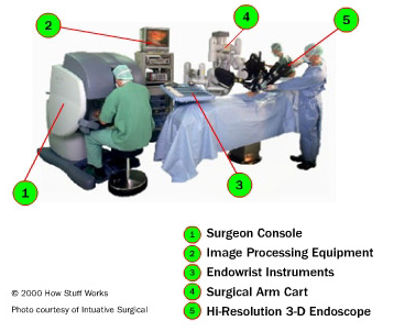 Taking a glimpse into the future, surgery may require only one surgeon, an anesthesiologist and one or two nurses. The doctor sits at a computer console, either in or outside the operating room, using the surgical robot to accomplish what it once took a crowd of people to perform. Robotic surgery has several advantages over conventional surgery, including enhanced precision and reduced trauma to the patient. Traditional heart bypass surgery requires that the patient's chest be "cracked" open by way of a 1-foot long incision. However, with the da Vinci system, it's possible to operate on the heart by making three or four small incisions in the chest, each only about 1 centimeter in length. Because the surgeon would make these smaller incisions, the patient would experience less pain, trauma and bleeding, which means a faster recovery. The robotic arms hold the rods in place. One of the rods has two endoscopic cameras inside it that provide a stereoscopic image, while the other rods have surgical instruments that are able to dissect and suture the tissue.