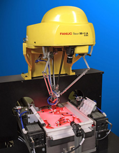 FANUC Robotics offers two variations of parallel-link “Genkotsu” robots. The FANUC M-1iA is a lightweight and compact four or six-axis, parallel-link robot designed for small part handling, high-speed picking, packing, and assembly applications. Its very small foot print and envelope allow it to be installed next to a manual operation with minimal engineering. The M-3iA robot is a larger version of the M-1iA. Available in a four- or six-axis model, the M-3iA offers the same unique parallel-link structure, and accommodates payloads up to 6kg. In addition, it has the largest work envelope of any robot in its class (1350mm x 500mm). FANUC Robotics refers to its series of parallel-link robots as “Genkotsu” or fists because they provide the accuracy and flexibility of a human hand.