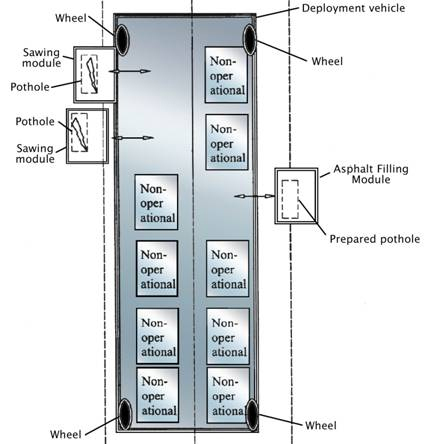 The figures below show the machine performing repair operations as well as possible placement of modules. The sawing modules are sawing into the asphalt over two potholes simultaneously. The asphalt-filling module is filling the pothole below its module. The modules have been moved outside of the main structure by robotic arms to perform these operations.