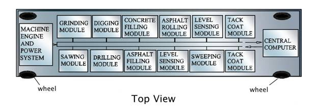 This analysis scans for irregularities, bumps, cracks, voids, and cavities in preparation for repairing the road surface by the use of robotic modules within the machine. This technology can also be used to build new roads, racetracks, airport runways, sidewalks, driveways, parking lots, etc. Multiple construction or repair functions are provided within one machine.