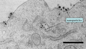 Electronic microscopy has captured images of the nanoparticles around and even within the cancer cells as seen below.