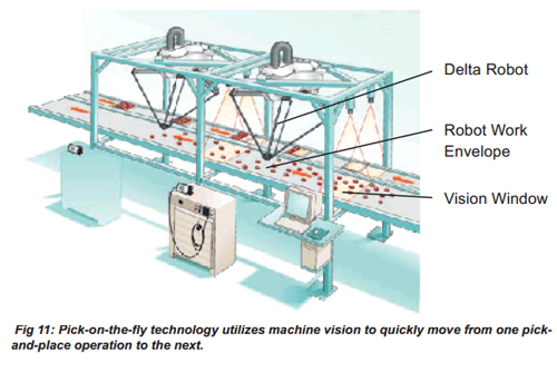 The Delta robot is only one component in the technology equation for this complex application. In most primary packaging applications the robot is guided by machine vision. The technology used for this application is called “picking on-the-fly”. As shown in the picture below, the vision system is positioned slightly upstream from the robotic pick and place operation. The vision system provides the robot multiple pick locations in a queue, or in the order in which the vision system identifies the products. This allows the robot to move from the completion of one pick-and-place operation to initiating the next pick-and place operation without delay. The pick-on-the-fly technology requires the products to be in continuous motion from the vision identification through the picking operation. This requires one more important piece of technology called “conveyor tracking”.
