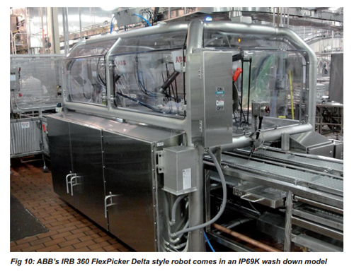 The original configurations of the Delta robots were designed to operate in the IP54 environment that allowed incidental water contact and wipe down with mild detergents comparable to household dish soap. In approximately 2001 the first “wash down” delta robots were introduced, being much more compatible with the sanitary standards and harsh wash down demanded by the industry. In the US hundreds of “wash down” configured robots have been placed into operation on manufacturing lines under USDA jurisdiction. Some limitations still existed as the IP67 rating required the food manufacturers to apply some special care to the robots during the sanitation process, mainly in the area of pressurized water contact. In 2008 the first IP69K rated Delta robot was introduced. This high content stainless steel manipulator truly addressed the requirements for operation in meat and poultry process and packaging applications.