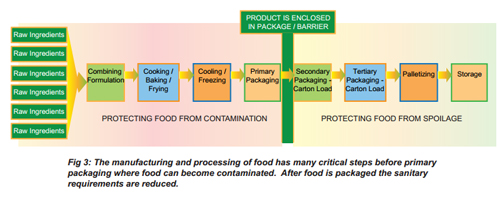 In food manufacturing the requirement of protecting the food begins as the raw ingredients enter the plant, and it progresses through multiple steps until the primary packaging operation is complete. The primary packaging operation creates a sealed barrier protecting the product from external contamination. Though the remaining process steps are important to protect the product from damage and spoilage as it completes the manufacturing process, as noted earlier, this paper will focus on the upstream processes and protecting the food from contamination up until it is packaged.