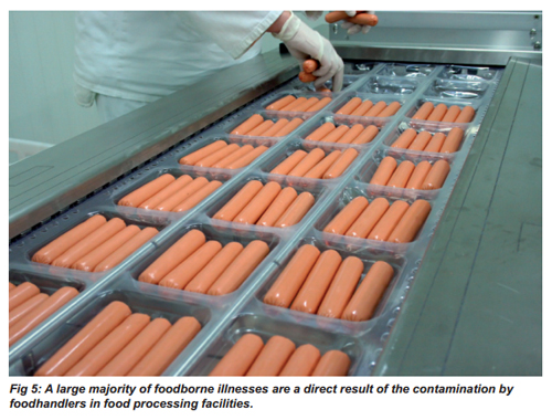 A large majority of the estimated 76 million cases of foodborne illness that occur annually in the United States are a direct result of the contamination of food by foodhandlers in food processing facilities. Transient foodborne microbes can be introduced from infected humans who handle the food, or by cross contamination from some other raw food product that a human recently handled. Food contamination can also occur when human hair, skin, nails, or other materials are found in food.