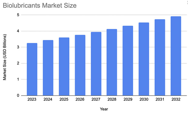 Besides molecular engineering, recent advancements of biolubricants over the last 3-5 years have improved their performance and made them a more viable alternative to petroleum-lubricants. Some of the biggest advancements in biolubricants have come with the recent technological advancements. For example, nanotechnology has led to the development of nanofluids and nanoparticles for biolubricants [6]. The polymer based nanofluids, which contain nanoparticles like MoS2, Cu, and graphene, reduce the friction and wear in biolubricants, which improves the performance, biocompatibility and durability of the biolubricants [7]. By using this, it also allows for self-healing and smart lubrication while still being eco-friendly [7]. Nanoparticles are also used to enhance the lubrication performance by reducing friction and wear of the lubricants [6]. They reduce friction by 26-34% and wear by 13-30% [6]. Besides nanotechnology there have been multiple advancements to improve the use of biolubricants. In a 2025 study led by Adewale George Adeniyi found advancements in biolubricant production. Recent advancements in chemical processes, including epoxidation, esterification and transesterification, have improved biolubricant production by enhancing the tribological performance, oxidative stability and efficiency [8]. These processes reduce friction, increase viscosity and improve biodegradability [8]. A November 2023 study led by Muhammid Ali Malik has focused on using algae as a sustainable feedstock option for biolubricants, instead of plant oils [9]. This is due to algae's potential to reduce the reliance on vegetable oils, which are very expensive, their high oil yield, biodegradability and the fact that they can grow in places that are not suitable for farming [9]. New efforts to improve the algae biolubricants production and stability are using better growing methods like enzyme processes and nanoparticles additives. All of these recent advancements do not only boost the performance of the biolubricants, but they also make them more globally sustainable, increasing the popularity of biolubricants compared to petroleum-lubricants. This is shown in the prediction of the biolubricants market size in the future as it continues to increase through every year.